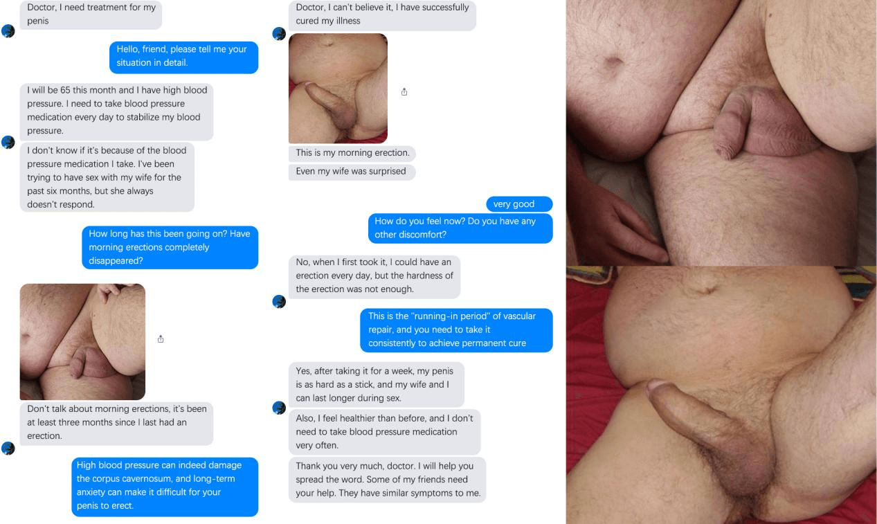 2. A case of erectile dysfunction caused by hypertension, with no morning erections. After medication-based treatment and recovery, the patient achieved normal erections, experienced increased libido, and was able to eliminate long-term dependence on hypertension medication.
